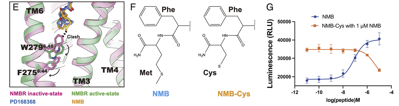 作者基于结构推测,NMBR 内源性激动剂 NMB 在 C 端的甲硫氨酸(Met)深入结合口袋,与 W6.48 残基发生空间冲突,推动该“开关”残基向下移动,从而触发受体激活。