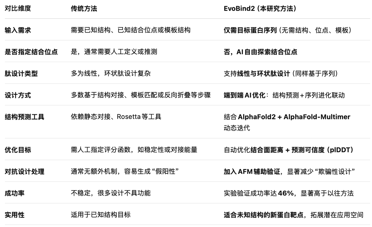 - 传统设计路径是“结构→功能”,而EvoBind2探索“序列→功能”,更贴近生物自然进化机制。