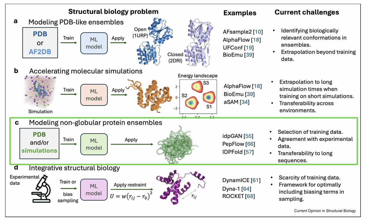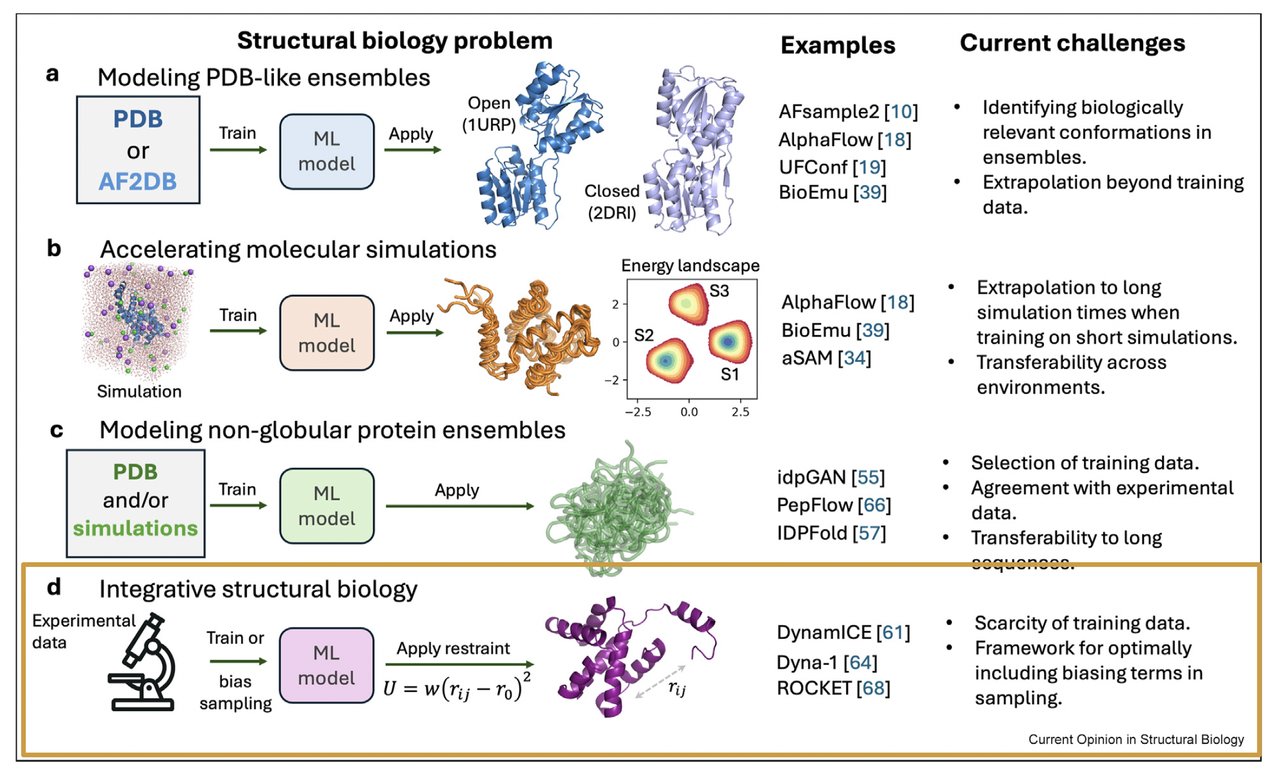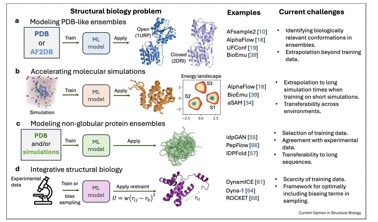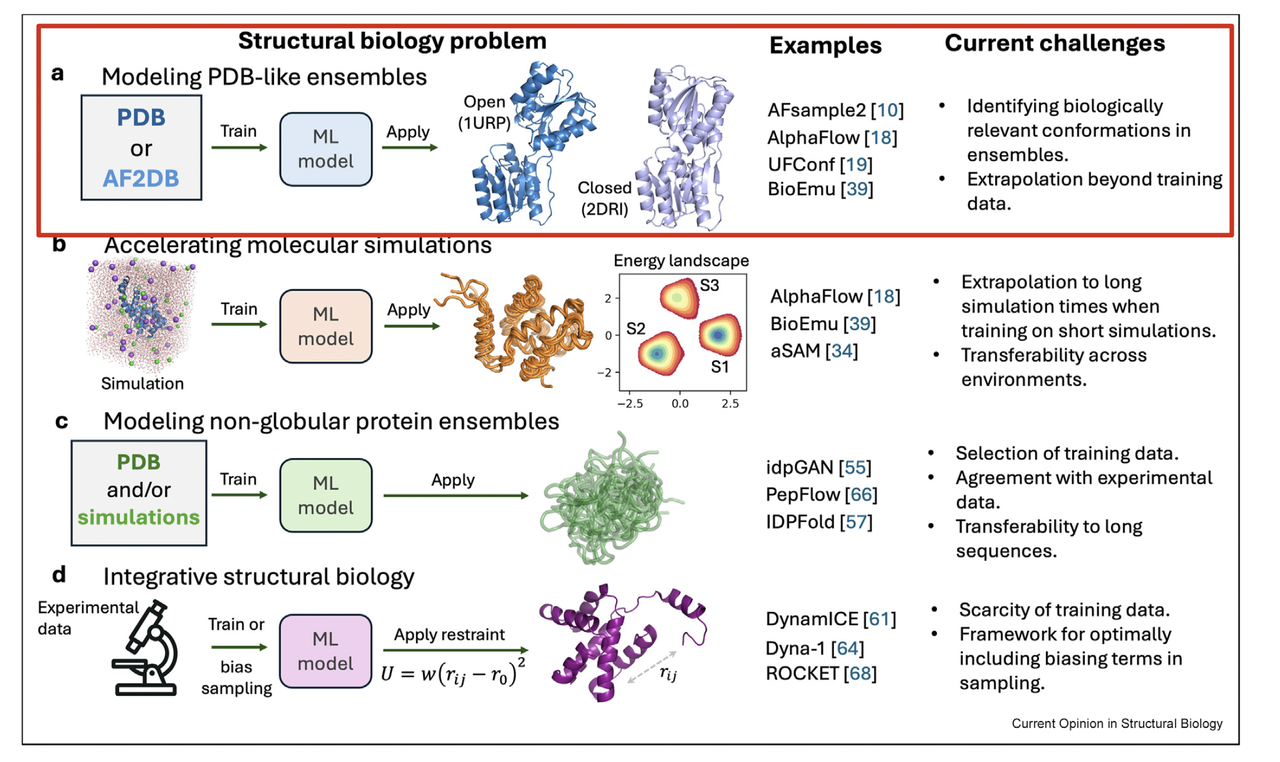 今天要介绍的这篇综述文章(《Generation of protein dynamics by machine learning》)正是聚焦于这个前沿问题:如何用机器学习的方法,不仅预测蛋白质的单一构象,而是预测其动态构象集合(conformational ensembles)。文章中的配图(Figure 1)非常直观地把研究方向总结为四条主线: