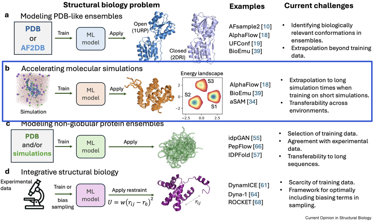 总结来看,Panel (b) 告诉我们:机器学习不是要取代分子动力学,而是让它“加速跑”。通过生成模型和混合策略,我们或许能在保证物理真实性的同时,把过去几个月的模拟压缩到几小时甚至更短。