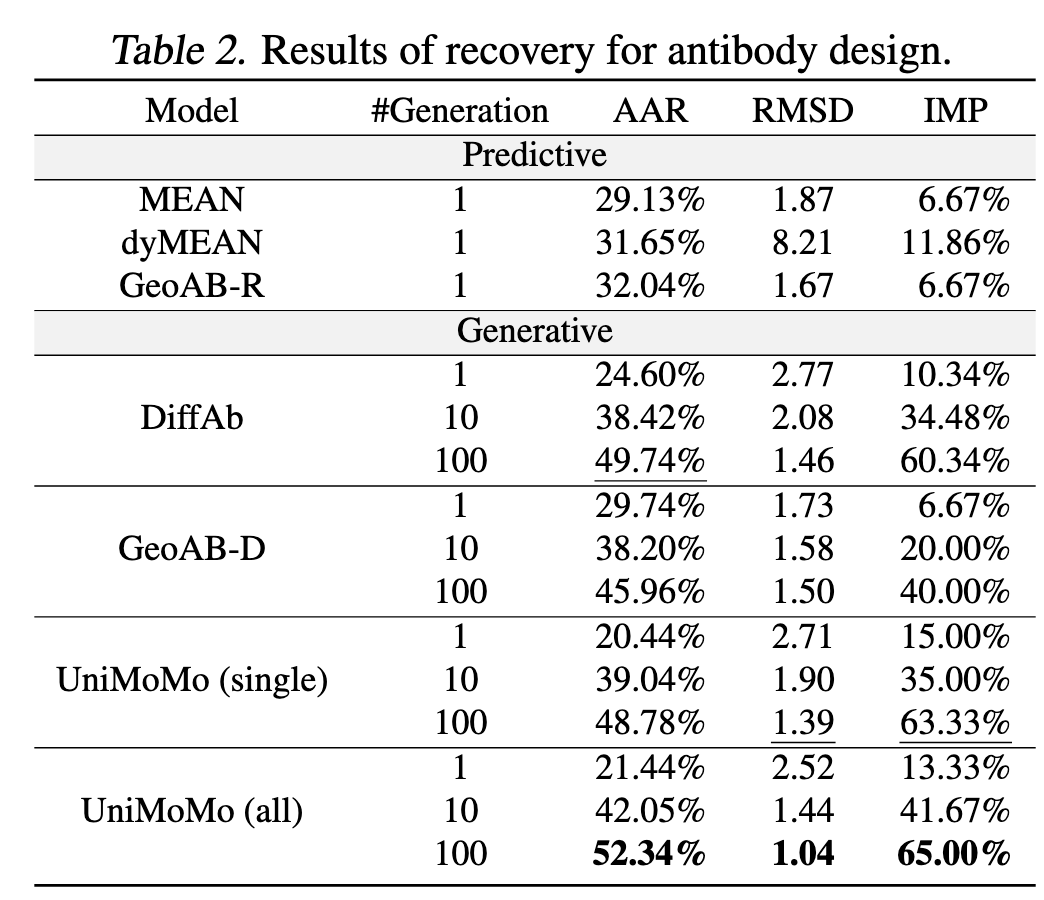 当生成 100 个候选抗体时,AAR(氨基酸恢复率)达到 52.3%,远超 DiffAb(49.7%)和 GeoAB(45.9%);