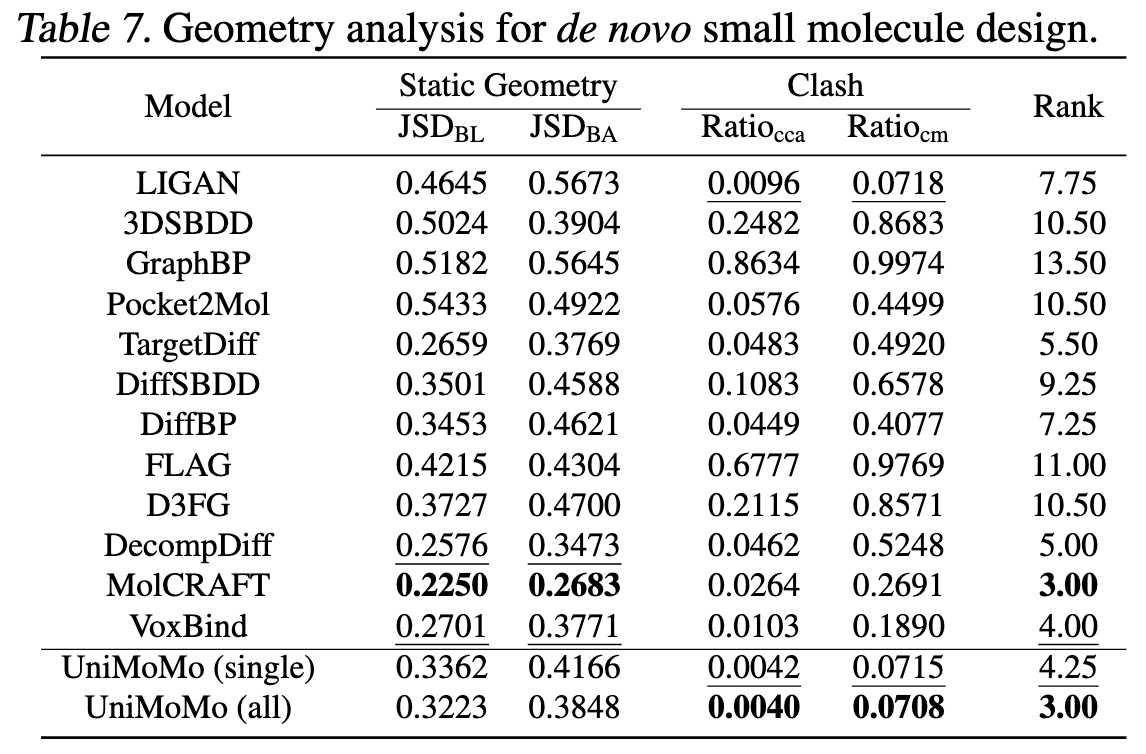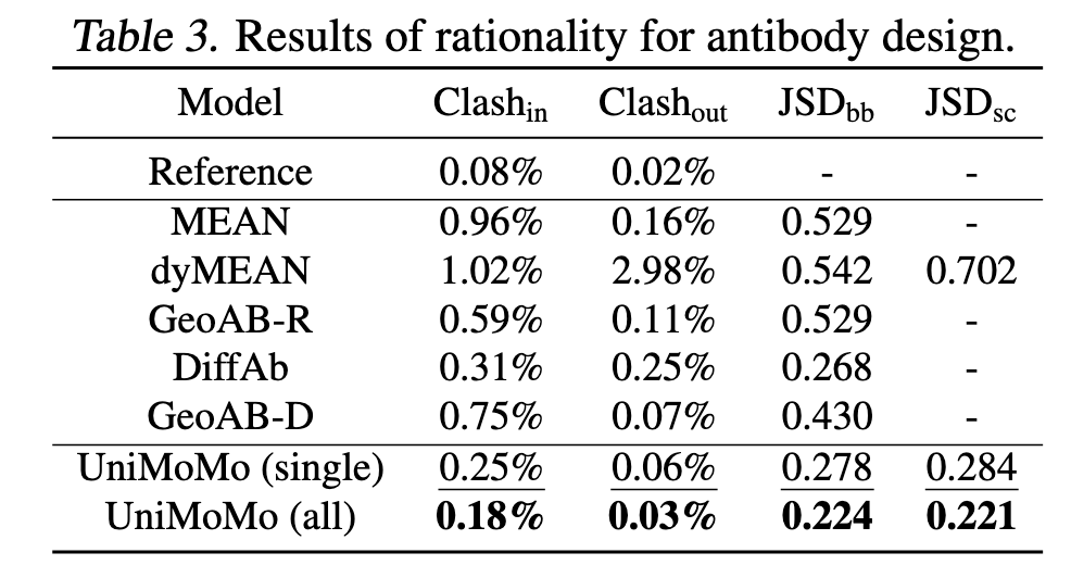 UniMoMo 的 Clashin / Clashout 比例极低(0.18% / 0.03%),说明生成的结构在原子层面几乎没有无效碰撞。
