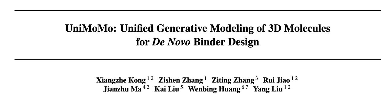 《UniMoMo: Unified Generative Modeling of 3D Molecules for De Novo Binder Design》,第一作者为 Xiangzhe Kong(清华大学)。