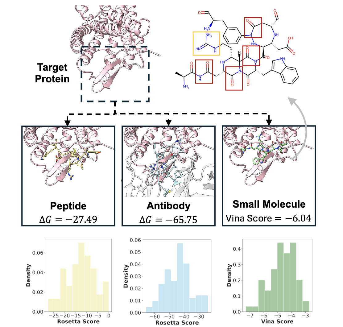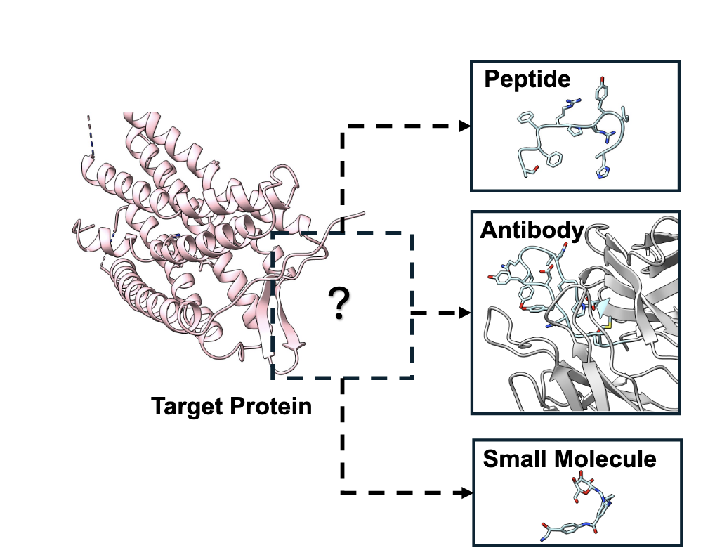 同一个靶蛋白的结合口袋(Target Protein),可以分别对接小分子、肽和抗体。