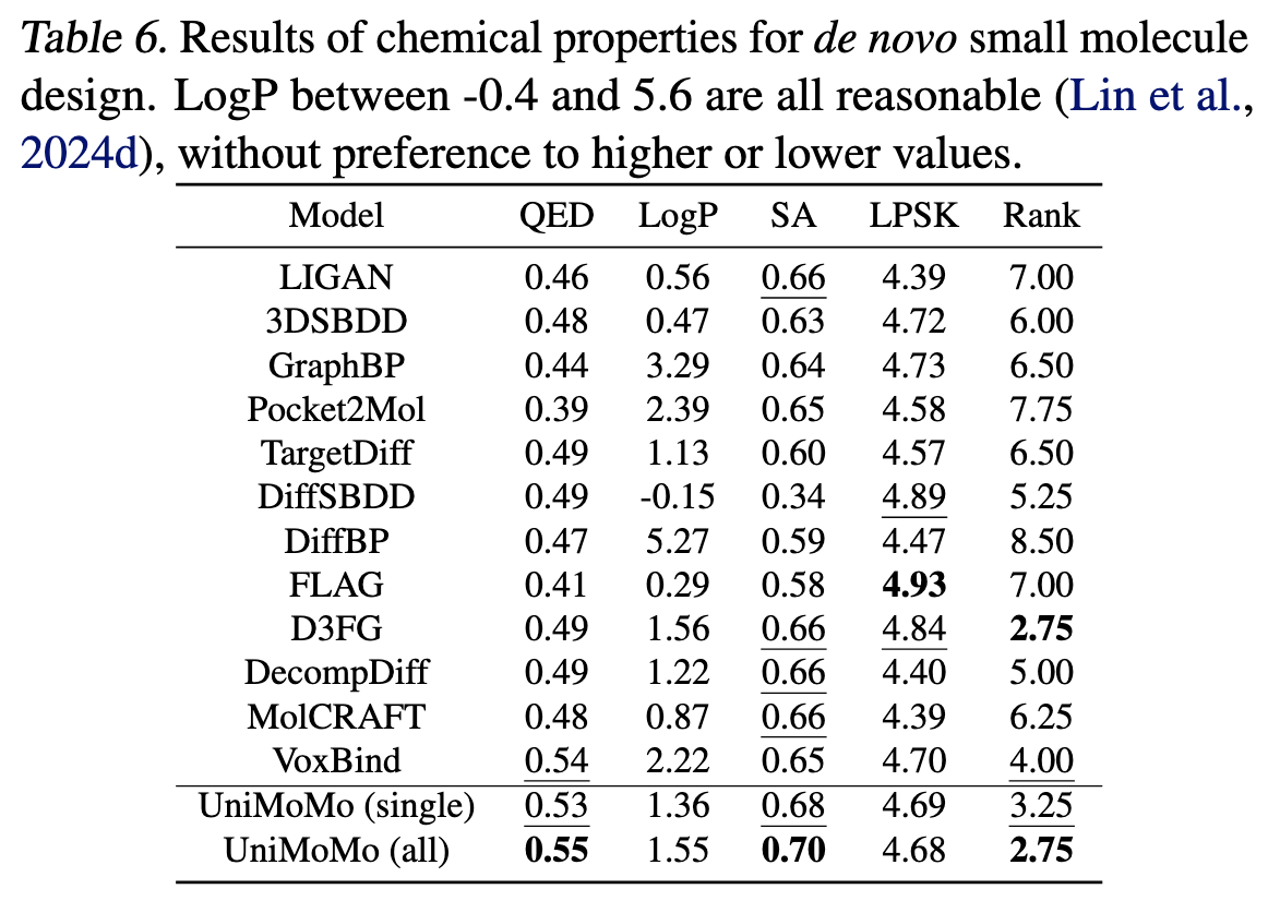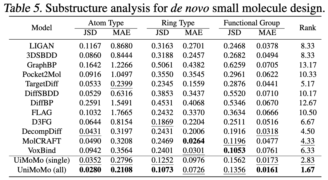 - 在“结构子单元一致性”上(Table 5),UniMoMo 的 JSD 仅 0.028,说明它生成的原子与环结构分布几乎完美匹配真实分子;