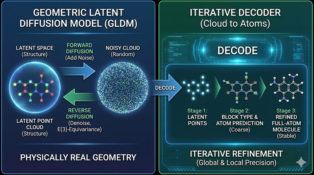 Diffusion 不再在原子层级运行,而是在压缩后的潜空间进行,大大降低了计算量,让抗体级别的分子生成成为可能。