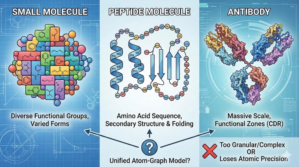 于是我们习惯性地认为——小分子、肽、抗体是三条平行的“AI 赛道”。每个赛道都有自己的生成模型、数据集和评估体系。