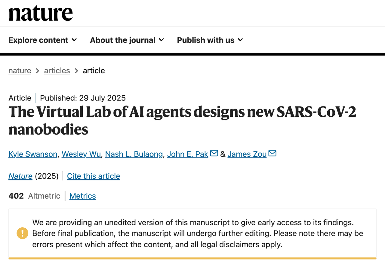 最近刷到一篇 Nature 的论文,名字是:《The Virtual Lab of AI agents designs new SARS-CoV-2 nanobodies》。简单说,这是一群大语言模型(LLM)自组团队,开了个“虚拟实验室”,然后真的设计出了抗击新冠变异株的纳米抗体,而且还实验验证了有效性。