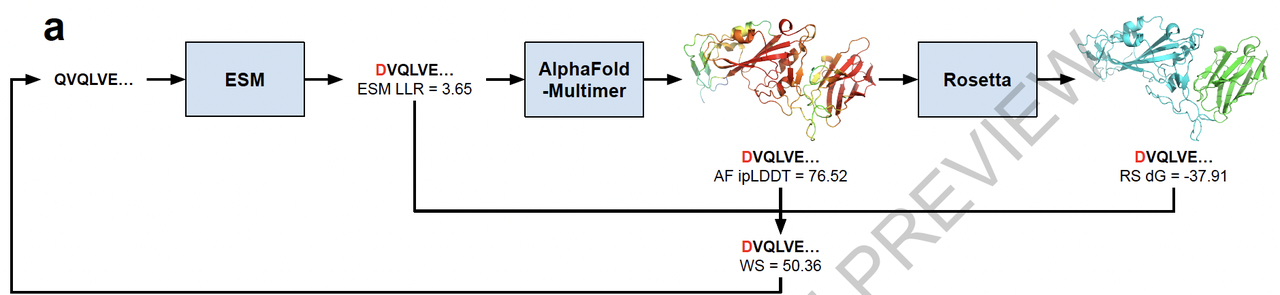 虚拟实验室设计抗体的核心流程是多轮迭代突变,每一轮都用三个工具协同评估: