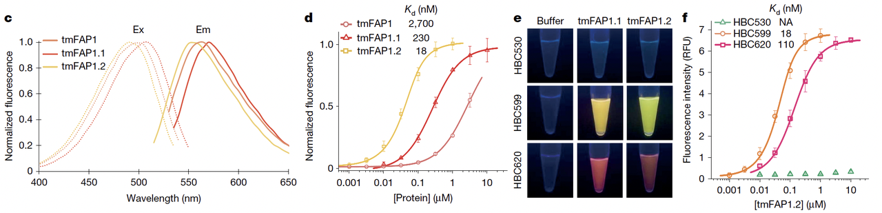 更重要的是,tmFAP 对目标分子 HBC599 表现出高度特异性,几乎不与其他类似分子结合(Fig.2e–f)。