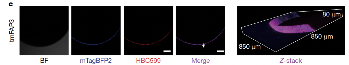 在哺乳动物 CHO 细胞中,tmFAP1.1 分布于内膜系统,而 tmFAP3 经过进一步优化后,可以定位到质膜,并在膜上产生明亮荧光(Fig.5c)。