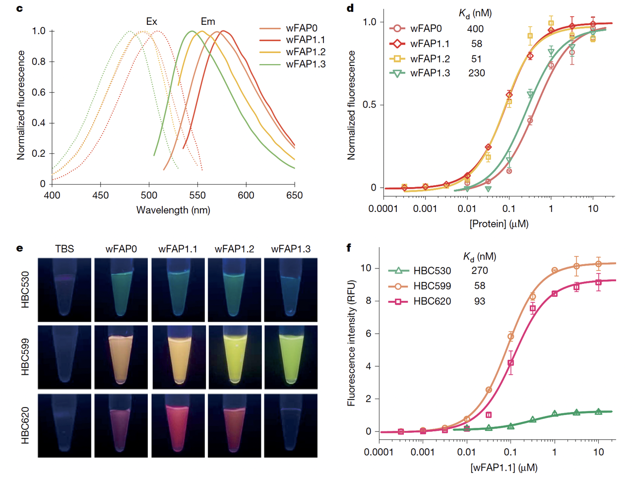结合常数 (Kd):wFAP1.1 对 HBC 的结合达到 58 nM,比 wFAP0 提升了一个数量级;