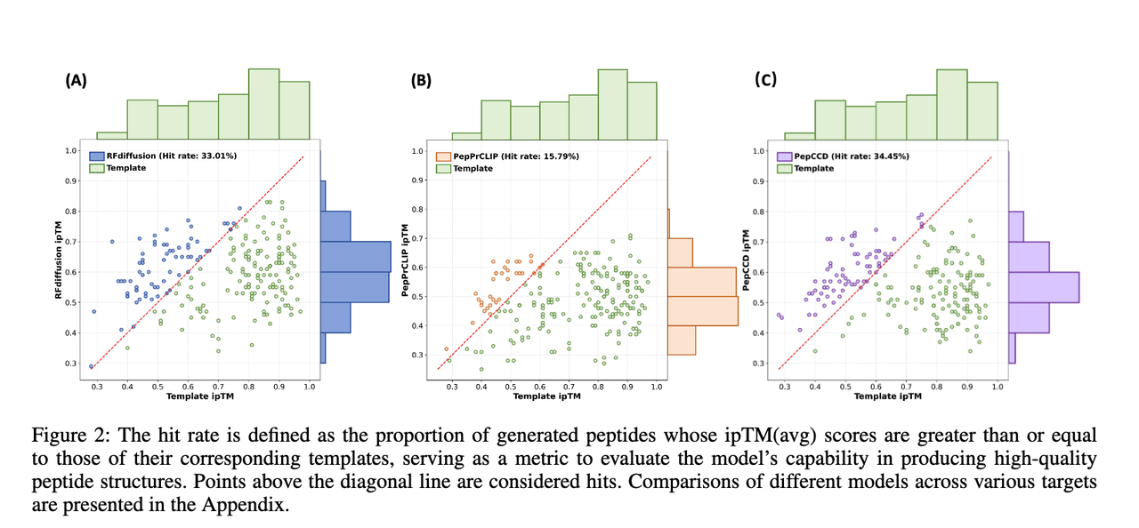 Figure 2 把不同方法的 命中率 画在对角线坐标上:点落在对角线以上,说明生成的肽比参考模板更优。