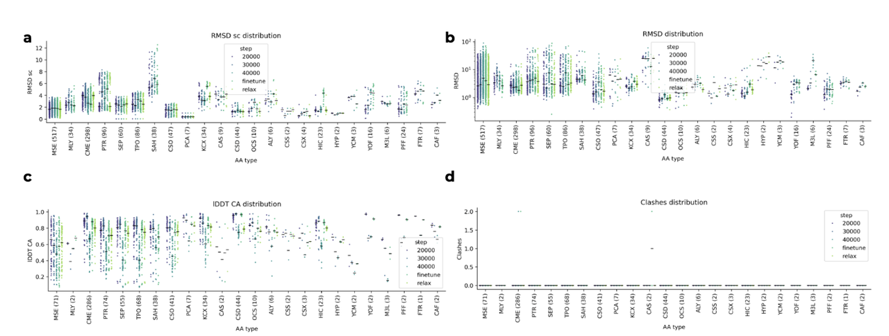 📌 结论:整体结构预测质量(IDDT)与局部侧链精度(RMSD)之间存在正相关关系;即当结构整体预测得好时,非天然氨基酸的预测也更准确。