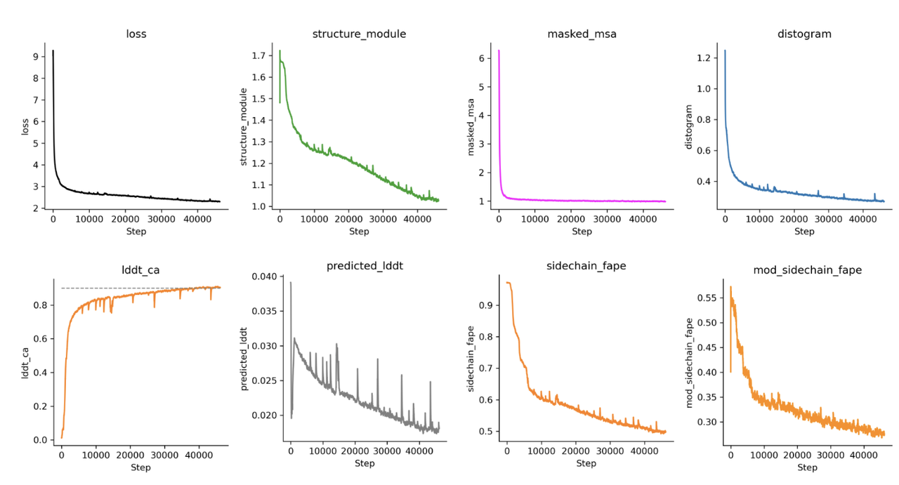 $$\text{Loss} = 0.5 \cdot \text{FAPE} + 0.5 \cdot \text{AUX} + 0.3 \cdot \text{Distance} + 0.2 \cdot \text{MSA} + 0.01 \cdot \text{Confidence}$$