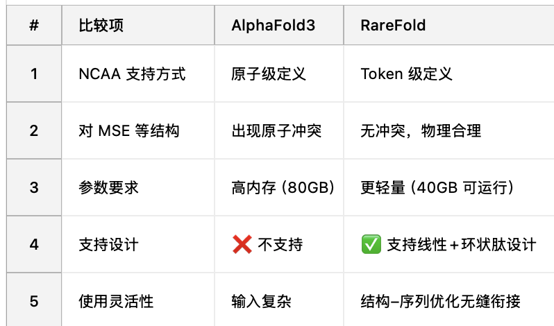- RareFold 进一步调整了 AF3 的多链建模机制,允许预测含NCAA的蛋白-肽复合结构(特别用于 EvoBindRare 平台的设计任务)。
