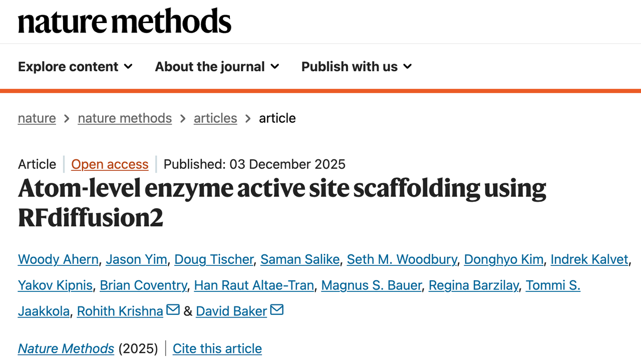 过去的AI工具(包括RFdiffusion1和2)试图通过简化建模来降低难度,但这种简化也让它们难以真正“理解”分子的化学相互作用。RFdiffusion2也在昨天publish在Nature methods上,感兴趣的读者可以去看看原文(https://www.nature.com/articles/s41592-025-02975-x),或者看我之前写的解读文章: