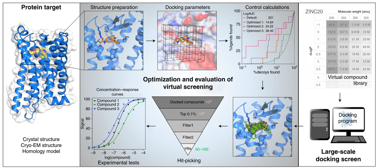 这是一个并不“友好”的靶点:缺乏已解析的复合物结构,也几乎没有已知的小分子配体。作者直接使用 AlphaFold 预测结构来定义结合口袋,并在此基础上进行筛选。