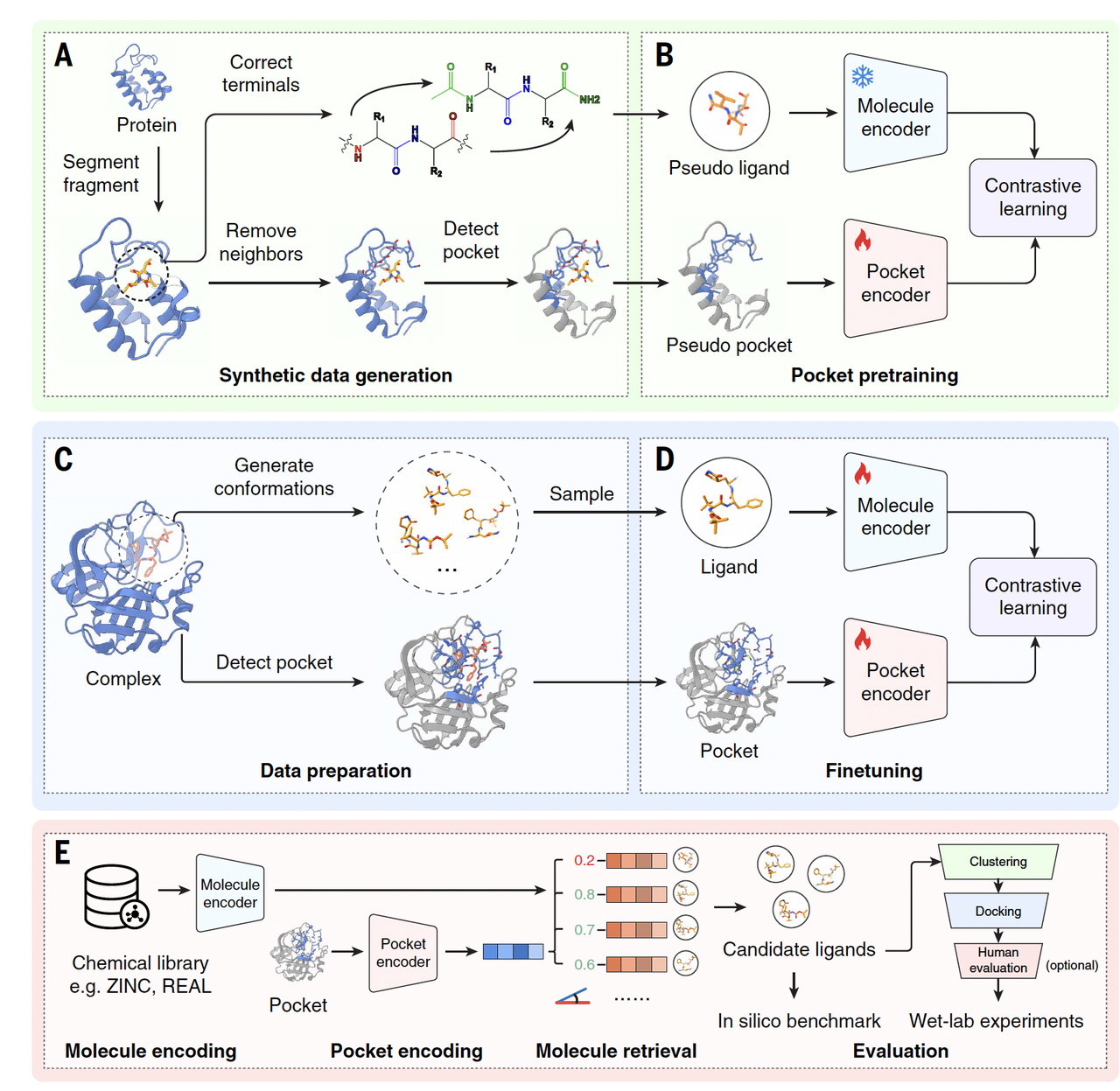 他们的核心做法,是引入对比学习(contrastive learning),来学习蛋白口袋和小分子之间的匹配关系。